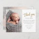 Este cartão de agradecimento de foto moderno apresenta agradecimento em letra dourada, mensagem pessoal e uma foto vertical na frente. O verso inclui uma segunda foto do bebê que é uma foto horizontal sem bordas. Clique em editar para personalizar este design.