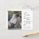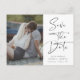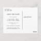 Esse minimalista salvando a data do cartão postal apresenta uma foto (orientação do retrato) e uma caligrafia moderna que diz "Salvar a Data" a tinta preta. A frente do cartão inclui os nomes dos casais, a data do casamento, a localização do casamento e uma foto. No verso, você pode adicionar detalhes do casamento como o site do casamento.