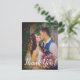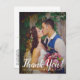 Na moda obrigado de casamento que você posta recursos de modelo de cartas Obrigado! em uma bela fonte de script manuscrita moderna com um monograma personalizado e uma foto de retrato da noiva e do noivo no lado frontal, e uma foto quadrada menor com texto personalizado que pode ser personalizado no lado de trás. O esquema de cores preto e branco clássico pode ser completamente personalizado.