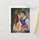 Na moda obrigado de casamento que você posta recursos de modelo de cartas Obrigado! em uma bela fonte de script manuscrita moderna com um monograma personalizado e uma foto de retrato da noiva e do noivo no lado frontal, e uma foto quadrada menor com texto personalizado que pode ser personalizado no lado de trás. O esquema de cores preto e branco clássico pode ser completamente personalizado.