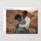 Elegante obrigado de casamento, seus cartões postais mostrando sua foto de casamento horizontal com cheio com "Obrigado" em letras brancas. Personalize este obrigado fotográfico moderno que você faz postais com seu nome para um toque atencioso e na moda. Na parte de trás da obrigado de casamento de fotos que você faz o cartão-postal inclui espaço para seu endereço de volta e uma mensagem pessoal, fazer que seja fácil expressar sua gratidão depois do grande dia. Perfeito por compartilhar sua foto favorita de casamento enquanto envia um obrigado de coração para seus convidados.