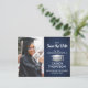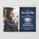 Compartilhe as notícias alegres de uma próxima festa de formatura com marinho de fotos azul e folha prateada falso, salve os convites de cartão postal. A imagem e o texto deste modelo são simples de personalizar e as cores podem ser alteradas com a ferramenta Zazzle design. Personalize-o com o nome do formando, o ano da classe e outros detalhes do lançamento da sua escolha. A design apresenta um fundo metálico esfregado, boné de conselho de morteiro de folha falsa, caligrafia moderna elegante, tipografia de vintage clássica e uma foto favorita, como uma fotografia de mais velho ou uma imagem da cerimônia de inauguração. Por favor, note que prata é cor verde de cinza impressa, não papel metálico. Estes cartões de na moda são uma maneira elegante de compartilhar uma celebração especial de dia com a família e os amigos. Parabéns ao formando!