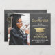 Compartilhe as notícias alegres de uma próxima festa de formatura com fotos personalizadas, salve os convites de cartão-postal dourado e falso. A imagem e o texto deste modelo são simples de personalizar e as cores podem ser alteradas com a ferramenta Zazzle design. Personalize-o com o nome do formando, o ano da classe e outros detalhes do lançamento da sua escolha. O design apresenta um fundo de quadro relativo a cinzas, boné de conselho de morteiro de folha falsa, caligrafia moderna elegante, tipografia de vintage clássica e uma foto favorita, como uma fotografia de mais velho ou uma imagem da cerimônia de inauguração. Por favor, note que o ouro é impresso a cor verde e não a folha metálica. Estes cartões de na moda são uma maneira elegante de compartilhar uma celebração especial de dia com a família e os amigos. Parabéns ao formando!
