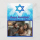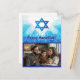 Este cartão Chanucá apresenta uma estrela azul cintilante de David no topo, colocada contra um fundo azul mais claro com efeito de brilho festivo. Abaixo da estrela, a mensagem "Feliz Chanucá!" é escrita em elegante branco cursivo em uma faixa azul escura. A metade inferior da placa inclui uma área de fotos personalizável, perfeita para adicionar um toque pessoal com uma foto de família ou de grupo. Dada a sua design e elementos personalizáveis, esta placa poderia ser chamada de "Cartão com fotos de Chanucá Estrela Espumante". Você pode personalizar o texto na frente e atrás para torná-lo ainda mais especial para seus destinatários.