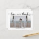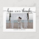 Cartões de agradecimentos simples e elegante de fotos de casamento chic com texto no estilo de script que diz, "Amor e obrigados". Adicione sua própria foto de casamento e personalize a mensagem no verso. Projetado por Kristine Lee Designs www.kristineleedesigns.com