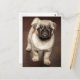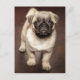 Foto de um adorável filhote de cachorro parado em um chão de madeira escura olhando diretamente para a câmera.