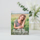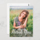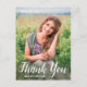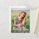 Este obrigado personalizado de graduação de fotos que você faz o cartão-postal apresenta uma foto na frente com a palavra "Obrigado" em um roteiro branco com seu nome para personalizar. Adicione uma mensagem de obrigados na parte traseira da placa e a assinatura acentuada por um boné de formatura preto em branco. Desenhado pela artista ©Susan Coffey.