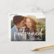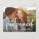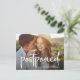Cartão-postal do Anúncio de casamento moderno. Design apresenta a cobertura de script de caligrafia em branco ''adiado'', sua foto e detalhes no verso.