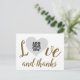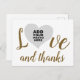 Um cartão postal branco para adicionar sua própria dentro de fotografia a forma de um coração de amor, escrito "amor e obrigados" em estilo de letra manuscrito... uma ideia elegante para dizer obrigado a vocês aqueles que estiveram com vocês no seu casamento