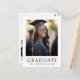 Cartão postal de agradecimento de formatura com sua foto e o texto "graduado" em uma fonte elegante com seu ano e nome da escola abaixo. Foto adicional e mensagem de agradecimento personalizada no verso. Texto preto em fundo branco.
