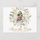Um elegante círculo de cor d'água, cor-de-rosa pincelada e rosa de creme de marfim neste adorável verão Salve o cartão postal da foto de Data. As manchas botânicas do eucalipto verde-sábio saem decoradas em meio ao conjunto de flores de pêssego acima da bela antiga escrita de ouro. A pincelada de volta a esta carta adiciona um toque romântico. Estes convites delicados são perfeitos para uma adorável cerimônia de jardim com uma recepção ao ar livre. Adicione sua própria fotografia de noivado.