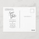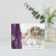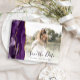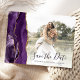 Esta elegante horizontal salvando a data do cartão postal apresenta uma borda agitada com cor d'água púrpura aparada com falso brilho dourado. Substitua facilmente a imagem de exemplo por sua própria foto da futura noiva e noiva. O texto personalizável combina o script de escrita manual roxa escura e a letra da placa; um filtro de gradiente branco ajuda a fazer o texto pop. Adicione seu endereço de devolução e detalhes adicionais ao lado inverso.