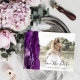 Esta elegante horizontal salvando a data do cartão postal apresenta uma cor d'água púrpura e borda agitada com falso brilho prateado. Substitua facilmente a imagem de exemplo por sua própria foto da futura noiva e noiva. O texto personalizável combina o script de escrita manual roxa escura e a letra da placa; um filtro de gradiente branco ajuda a fazer o texto pop. Adicione seu endereço de devolução e detalhes adicionais ao lado inverso.