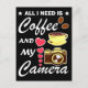 O design diz que "Tudo que preciso é café e minha câmera" é o presente perfeito para quem ama fotografia e gosta de café. Ele faz uma opção ideal para um presente de aniversário e perfeito.