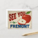 Um cartão postal encantador da viagens vintage Fremont California com uma adorável maçã vermelha, juntamente com um texto divertido no estilo retrô que diz, "Vemo-nos em Fremont"