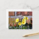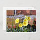 As primatas são uma das primeiras flores a aparecer na primavera. Uma fotografia de primatas amarelos pálidos contra uma parede de tijolos rústicos.