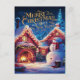 Cartão de Natal festivo com um boneco de neve alegre em frente a uma casa aconchegante em uma paisagem nevada.