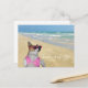 Este cartão postal bonito de praia de córgi apresenta uma engraçada Pembroke Welsh Corgi vestida com uma bonito biquíni rosa e óculos escuros enquanto tomava sol numa bela praia. Cachorro hilário em cartão de roupas para alguém que ama humor de corgi e fotos de verão nas férias. Deixe o texto como Pensando em você ou personalize-o com sua própria citação.