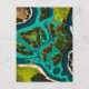 A vibrant aerial illustration of lush green islands and winding waterways, blending teal and emerald tones in a bold, futuristic style. This top-down view captures the intricate network of land and water, showcasing the unique beauty and architecture of floating landscapes.