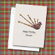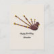 Um cartão postal de aniversário com ilustração detalhada de gaita de foles, adornado com ouro e padrões de nós celtas decorando a bolsa. Perfeito para enviar a um gaiteiro ou um amante da Escócia!