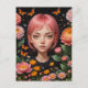 Cartão Postal Garota Adorável com Cabelo Rosa nas Flores
