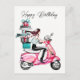 Uma garota cavalgando um carregando cor-de-rosa com muitos presentes.
