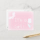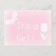 Garota primavera - cartão postal personalizado de anúncio de nascimento. Design de texto delicado em rosas claro com texto branco "É uma garota". Ele apresenta a silhueta branca de uma tulipa e uma borboleta. Ideal para anunciar o nascimento de uma menina fofa que estava nascer em primavera.