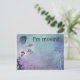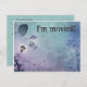 Este cartão postal é um anúncio de uma nova casa, apartamento, condomínio, etc. Ele apresenta uma garota voando com um guarda-chuva, um relógio de fusão e um posto de lâmpada torcida. Uma árvore é à direita e as flores estão no fundo. O texto na frente diz "Estou me movendo". O texto à frente e atrás é editável, então vá em frente e mude o que ele diz. Altere o tamanho da fonte, posicionamento e cores também e torne-a sua própria!