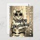 Foto engraçada de gato de festa com óculos de sol segurando copo de bebida. Maneira única e divertida de desejar feliz aniversário.