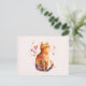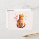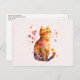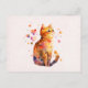 Cartão postal com uma ilustração adorável de aquarela. Um gato de mesa laranja parecendo amigável e feliz com corações girando em volta.