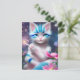 Cartão Postal Gato de gato branco Kawaii listrado, rosa e azul