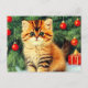 Cartão postal com um gato natal vintage! Um gatinho laranja com listras pretas senta-se na neve. Atrás do gato está uma árvore de Natal com ornamentos vermelhos e amarelos. Também na neve há um presente vermelho. Um presente perfeito para a época de Natal e amantes de gatos!
