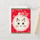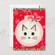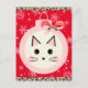 Um cartão de Natal de gato bonito com um rosto de gato em um ornamento cor-de-rosa adornado com um arco e sagrado. Há flocos de neve no fundo. Um cartão postal de Natal bonito para amantes de gatos.
