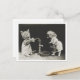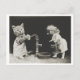Este cartão-postal é uma reprodução de uma estranha foto escura e branca mostrando um gato (vestindo roupas) e uma boneca em uma bomba d'água. Porquê? Quem sabe?