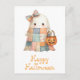 Deseje a todos um feliz Dia das Bruxas com este truque fofo ou um cartão-postal com uma ilustração de um fantasma de manta de retalhos com uma abóbora!