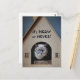 Cartão postal apresenta imagem de um gato sério usando óculos pretos enquanto olha para fora de casa. O texto diz "É MEOW ou Nunca!"