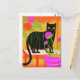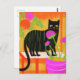 Cartão Postal Gato preto-branco com faixas verdes em plantas dom