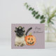 Esta é uma pintura aquosa de um gato siamês com olhos azuis vestindo um chapéu pirata. Ela está confortavelmente deitada ao lado de uma lanterna jack O’. O texto diz "Dia das Bruxas Feliz". Cartão perfeito para amantes de gatos.