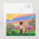 Contra um fundo de uma bela folhagem e um céu multicolorido, um gato Selo de Chocolate Siamês fica à luz de uma estrela do dia.