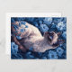 Um gato siamês com olhos azuis flagrantes se senta em meio a um jardim de flores azuis. O pelo branco do gato contrasta lindamente com as cores azuis profundas das flores, criando uma cena visualmente cativante. O olhar do gato é direcionado para a direita, acrescentando um senso de mistério e intrigação à imagem. O fundo é um borrão azul e verde, sugerindo uma atmosfera serena e pacífica.