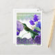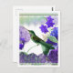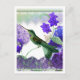 Um belo beija-flor verde iridescente, empoleirado sobre um delicado caule vegetal, rodeado de flores roxas e azuis, incluindo Hydrangeas, bordado por cristais multicolores, pérolas verdes de foca e design de rendas roxas.
