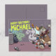 Dois gatos engraçados de rua skatistas em um cartão postal de aniversário personalizado. Use "Personalize este modelo" para alterar o nome e criar uma mensagem única e personalizada. Apresenta um gato tabby skatista de shorts e camiseta, e um gato laranja ou ruivo com latas de spray desenhando grafite na parede atrás, já pintada com grafite de erva-cidreira e caveiras de gato.