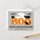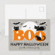 Envie saudações assustadoras com nosso cartão postal de Halloween de gatos pretos e morcegos Boo. Este cartão postal personalizado apresenta um "Boo" laranja em negrito cercado por adoráveis gatos pretos e morcegos, criando o tom sinistro perfeito. O design ganha vida com um modelo de texto que inclui duas linhas. A linha grande e em negrito deseja um "Feliz Halloween", enquanto a segunda linha em letra cursiva oferece espaço para uma assinatura personalizada, seja sua ou de sua família. Compartilhe o espírito da temporada com este cartão postal divertido e personalizável.