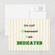 Um postal divertido com o texto "Não estou obcecado por ser dedicado" em letras negras. O O de obcecado tem a forma de um botão liga/desliga do computador, e o fundo é um padrão de repetição binário de 0 e 1's. Para quem adora passar tempo no computador.