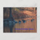 Gansos canadenses na água ao pôr do sol com o pôr do sol refletindo na água, com os gansos e uma árvore cega à esquerda que é brilhante e colorida. Isso é num CARTÃO POSTAL.