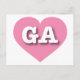 Este cartão-postal apresenta um coração cor-de-rosa vibrante contendo as letras maiúsculas, brancas, em negrito, GA, a abreviação oficial da Georgia, o estado de pêssego. O reverso do cartão postal é vazio, aguardando seus sentimentos manuscritos ou texto personalizado.