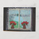 Uma linda pequena pintura a óleo de uma janela com vista para o lago, com cortinas rendadas e vasos de gerânios no parapeito da janela, .