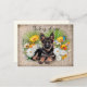 Thinking of you, German Shepherd dog postcard. White daisies, yellow calendula, palmetto palm fronds and a blue butterfly surround a sweet pup lying in a bed of flowers. Background image is dark linen fabric (design only) with black script along the top that is easy to change to your choice of greeting. Hand-write a greeting or message on the back where a similar shepherd image is the backdrop.