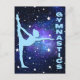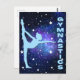 Design de Ginástica Galáctica com estrelas brancas, via láctea, silhueta de ginasta feminina em azul pó claro e diz ginástica em forma vertical.