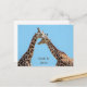Cartão postal personalizado com um retrato de duas girafas em uma pose afetuosa contra um céu azul brilhante. Você pode personalizar facilmente com os nomes de um casal, criando um anúncio especial de noivado, casamento ou aniversário. Fotografia tirada em San Diego, Califórnia.